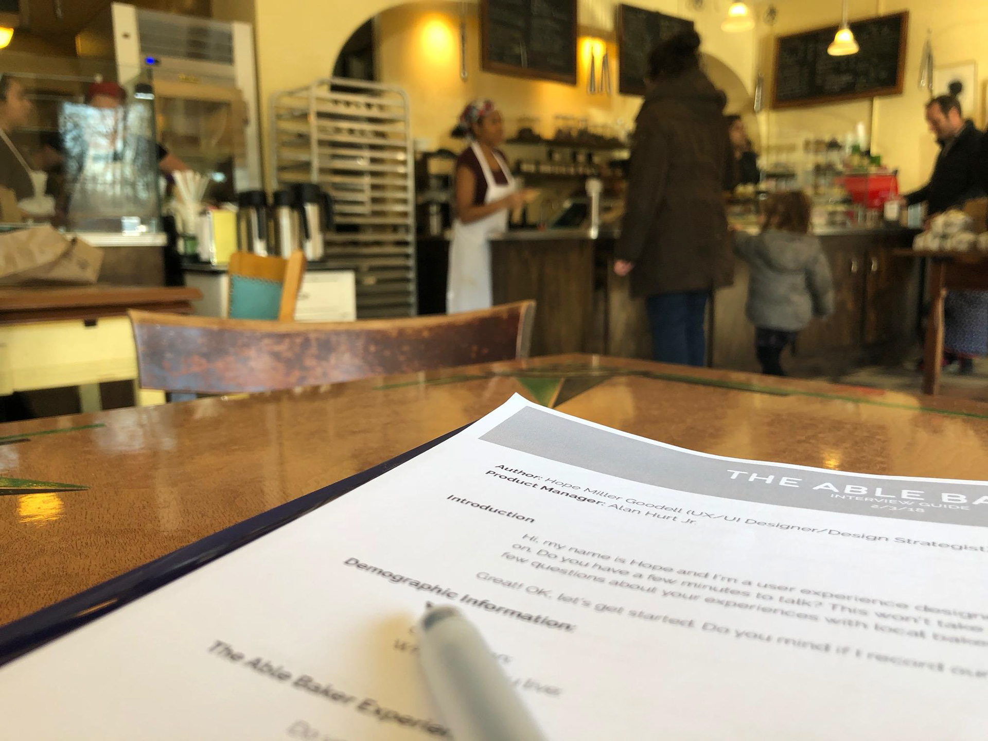 Informed by my secondary research, I developed a list of questions and an interview guide to structure my contextual inquiry. On a busy Saturday morning and early afternoon, I sat at a table in The Able Baker. Armed with my coffee and scone (not a bad gig!), I struck up conversation with people and persuaded them to talk to me for few minutes about their experiences with The Able Baker, other local bakeries in town, and bakery special orders. During the interviews, I recorded the audio of each and took notes as I asked questions and observed. You can find my interview guide here >.