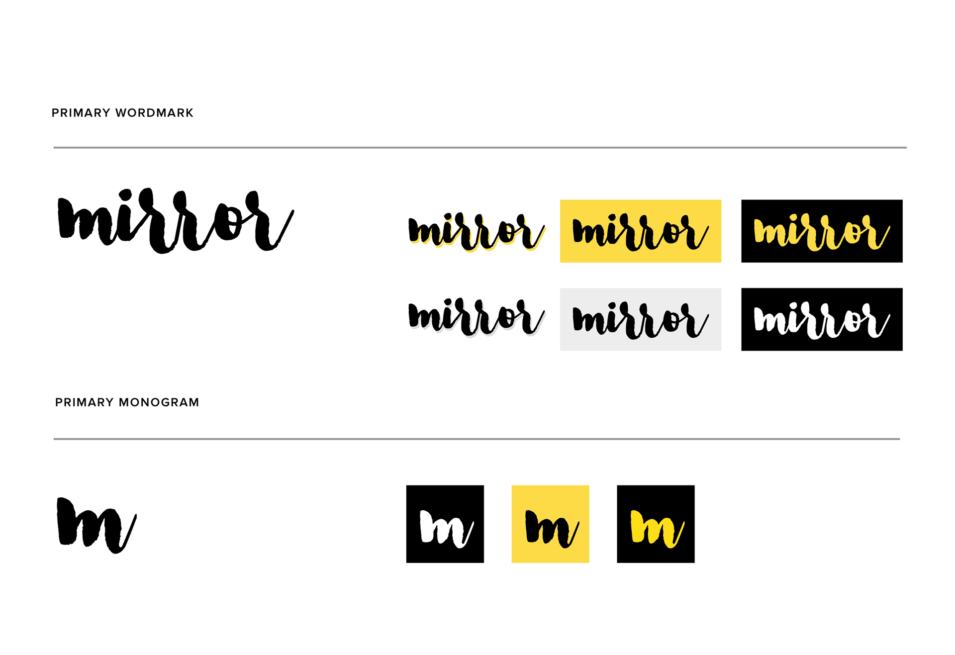The initial, unrefined explorations shown above helped me hone in on a few different directions I might pursue. Reflecting once again upon Mirror's brand attributes, I determined that a brush script logotype best conveyed the feeling of a brand that was chic yet accessible, modern, playful, and uncomplicated. It stood out from the direct and indirect competitors I'd identified in the initial project research, while also maintaining a look that fit within the market. Further, I felt it would be a good match in terms of appealing to the aesthetics of my primary user audience (Jenna, my persona), as well as the broader customer base that Mirror aims to attract.