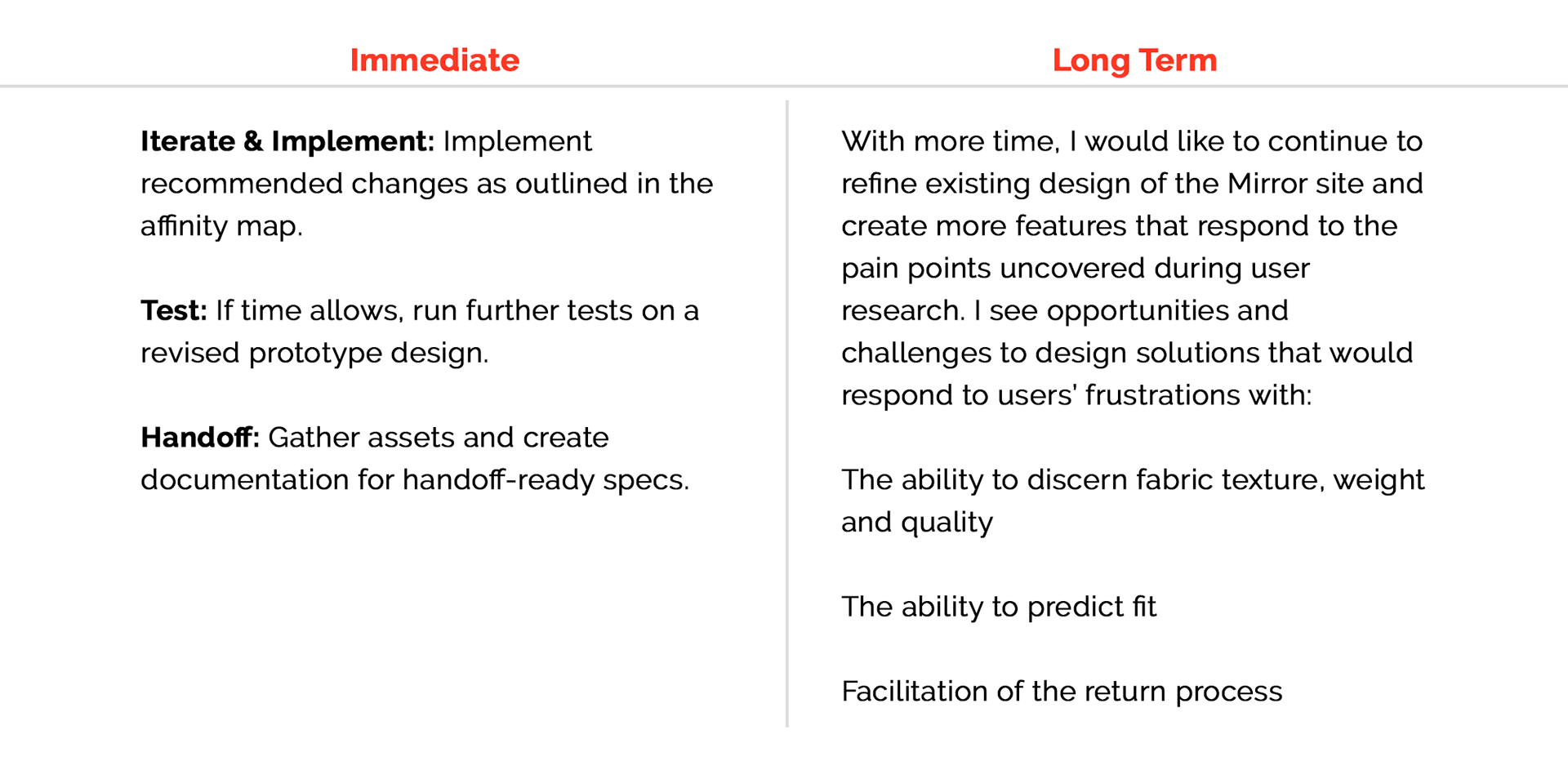 By basing the design for Mirror on research, grounding design decisions in empathy, and testing often throughout the process, I had a compass to help me navigate and continue moving closer to my goal of creating a design that actually works for people and makes the routine experience of purchasing clothes smooth, easy, and enjoyable.